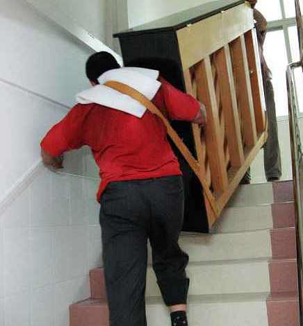 4、如果鋼琴要搬上樓,最好也要有四至五個人。首先要保證搬琴人的安全,同時鋼琴不能碰撞、劃蹭,外表的保護重于內部。鋼琴的背面朝墻壁,鍵盤朝樓梯的扶手。兩人在下,三人在上,最好用寬布帶挎在肩上兜住鋼琴的車腳。同時用手抓住琴背的把手和鍵盤底下(不能拉鋼琴的腿),抬起鋼琴一鼓作氣搬上一層樓再休息。特別要注意的是,鍵盤的一側不能碰扶手,車腳不能碰樓梯。到一層樓面拐彎時要當心碰撞、調整好方向然后再抬起往上搬。進房門時,也要當心蹭著門框,保證最后安全地把鋼琴放到安排好的位置上。